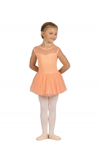 Wide shoulder tank dress with raised floral print on front mesh panel and along back. Dress also features full volume mesh skirt and a clasp at back. Fully front lined. Nylon/Spandex.